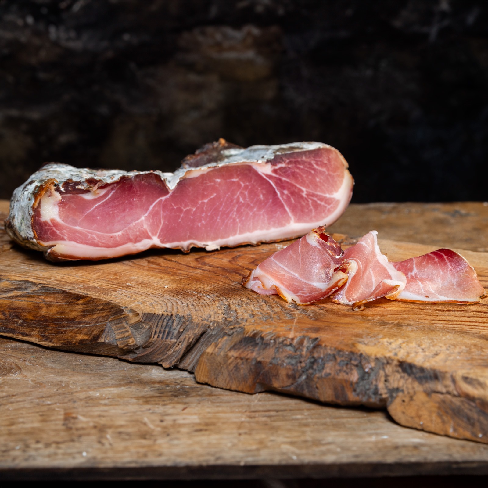 Lo Speck Pancetta artigianale grazie alla sapiente speziatura e alla stagionatura di 4 mesi è un salume molto dolce ma dal sapore intenso e deciso. E’ ideale per chi ama i salumi dai sapori autentici e profumati.